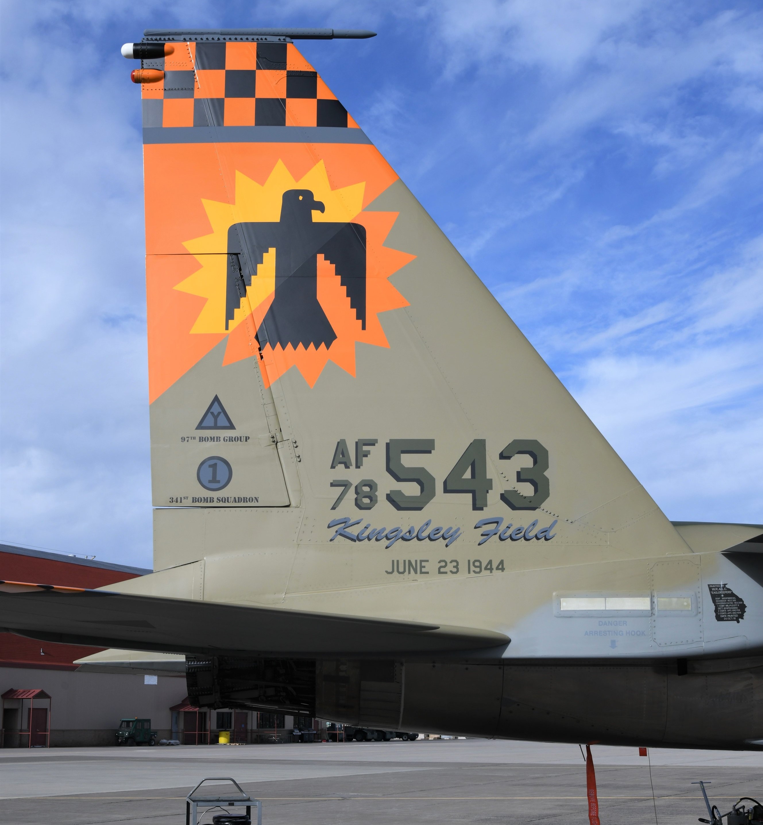 The paint job crew included Drew Sorlien, Tim Bodner, Cameron Curtin, Jeff Southern, and Derek Larman. It’s dedicated to Second Lieutenant David R. Kingsley, a radio operator on B-17s, killed in action on 23JUN1944, after a bombing mission over the oil fields at Ploesti, Romania. He was posthumously awarded the Medal of Honor for taking off his parachute and strapping it on a wounded member of the crew. The 173rd Fighter Wing is based at Kingsley Field, named in honor of David Kingsley.