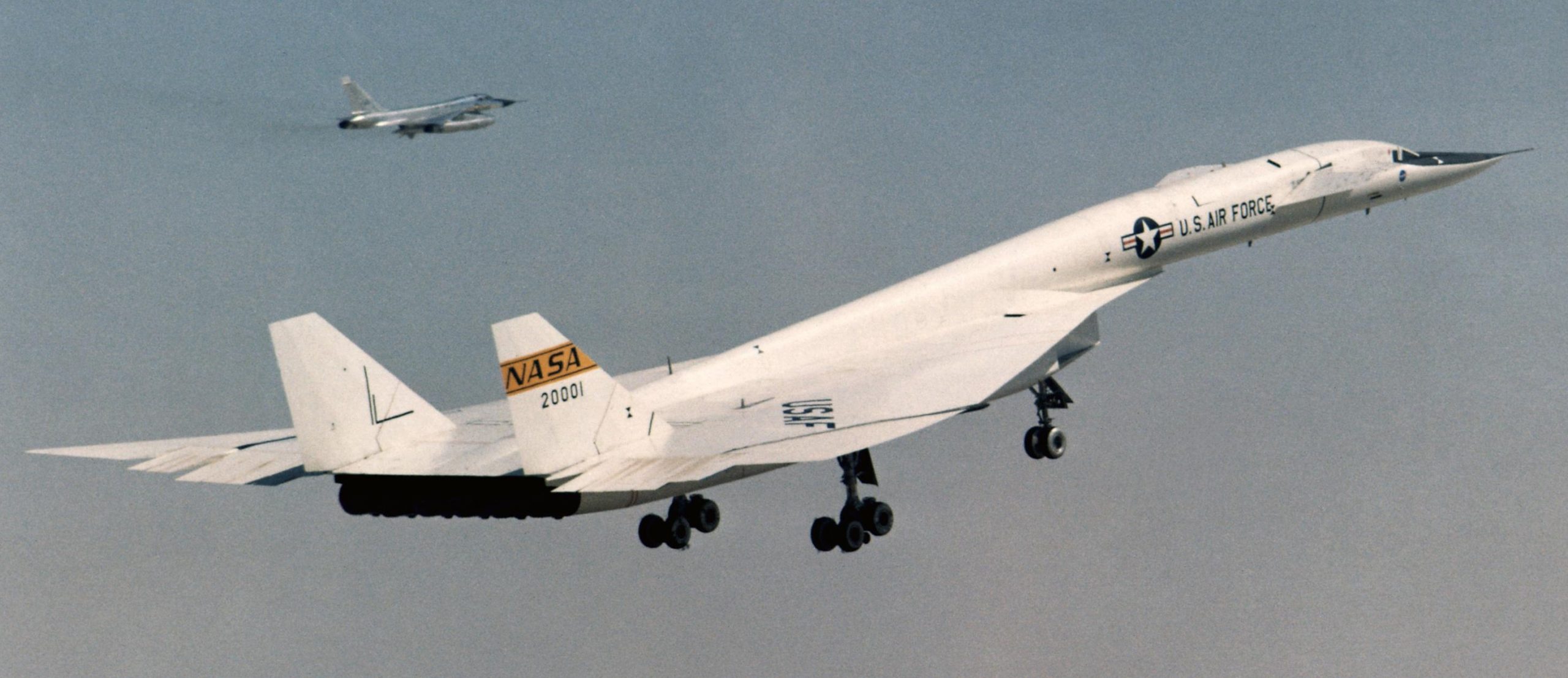 The 1st XB-70A (#62-001, tail #20001) taking off with TB-58 bomber-trainer acting as chase plane. The TB-58 could fly at Mach-2, but the XB-70A could hit Mach-3.