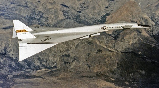 The original chase plane was a TB-58 Hustler. The trainer version of the Hustler bomber was fast and could keep up with the XB-70 by cutting inside the Valkyrie’s turns. NASA photo.
