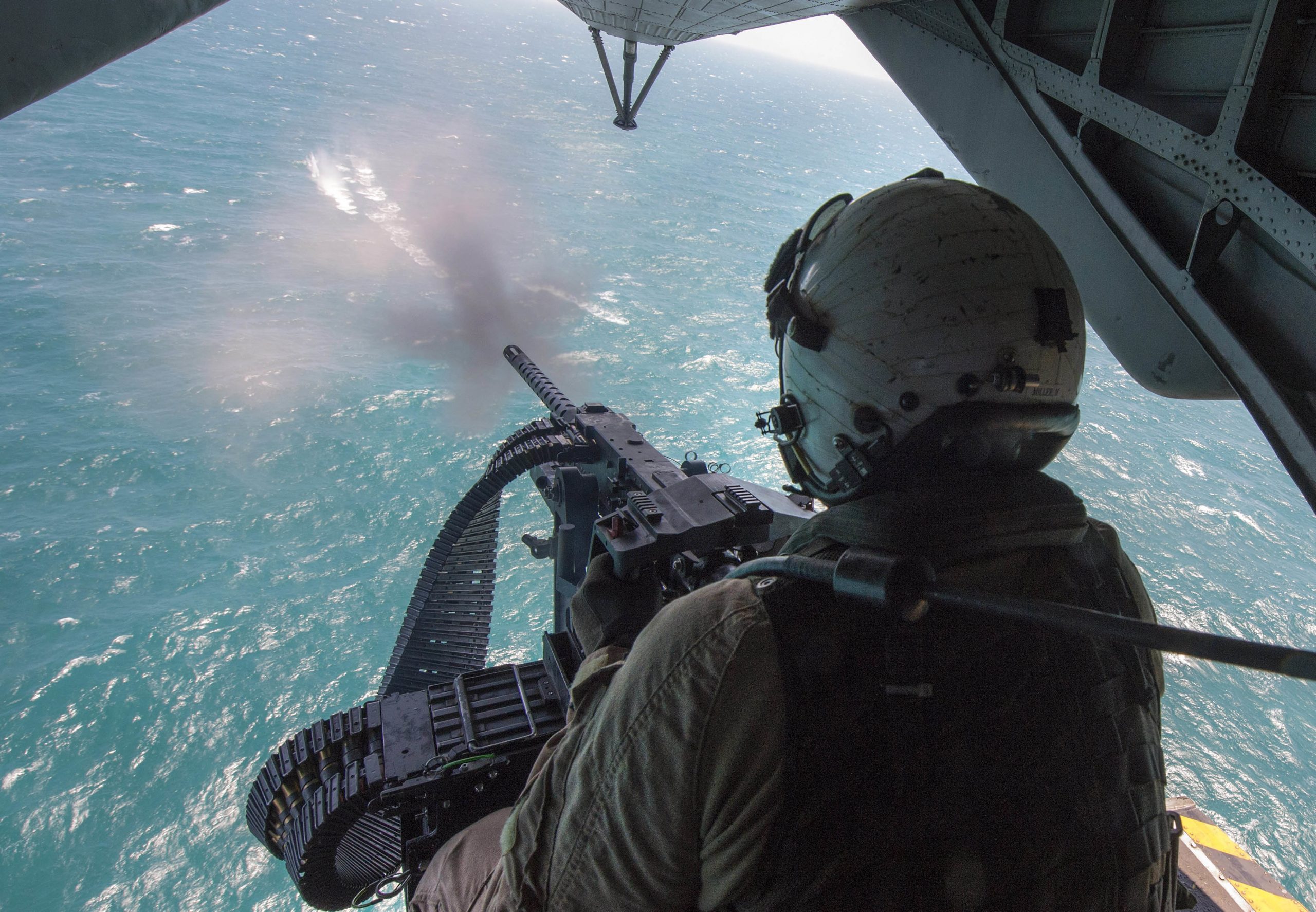 U.S. Navy (USN) .50-cal gunner, positioned on the rear ramp of a MH-53E Sea Dragon helicopter.